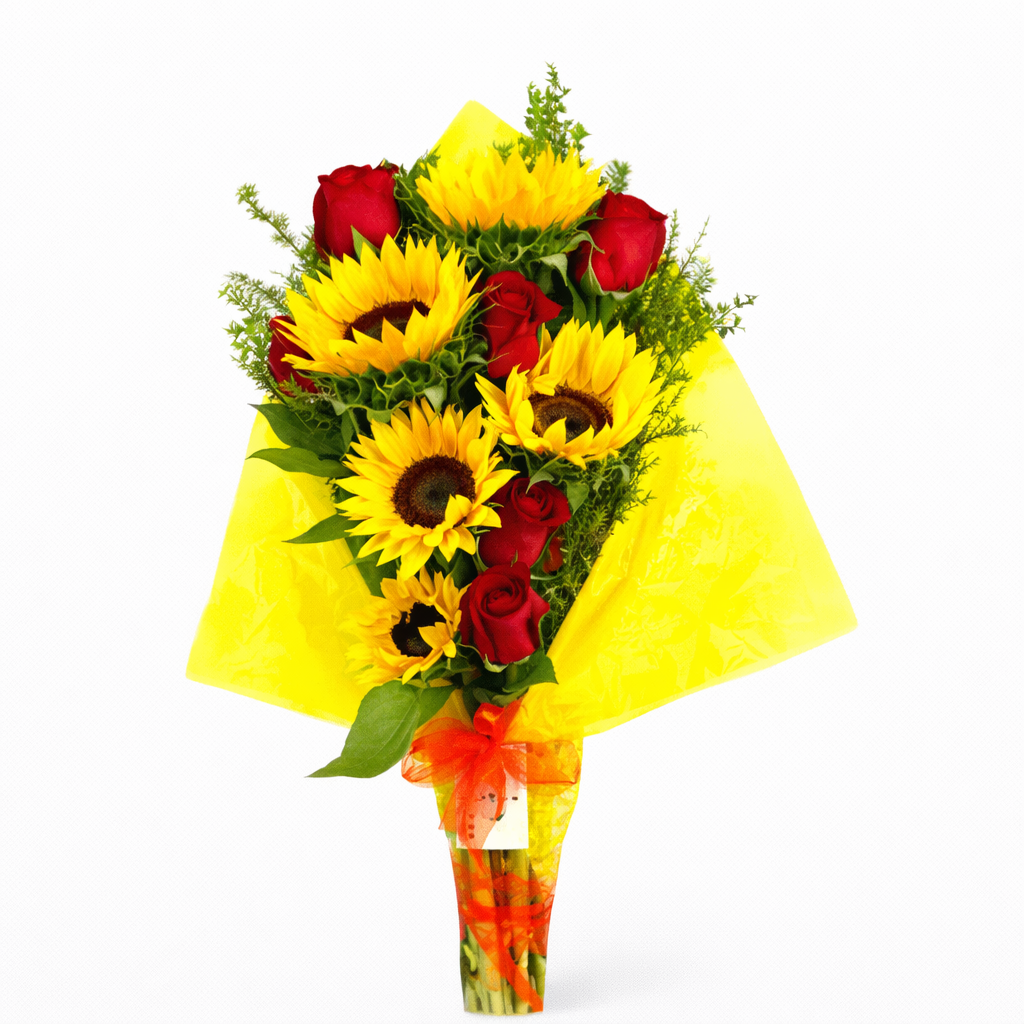 Arreglo Floral del tipo “Ramo”, el cual se compone de 6 Rosa importadas acompañadas con Girasoles y diversos complementos florales. (Colores de flores y decoración sujeto a stock disponible)