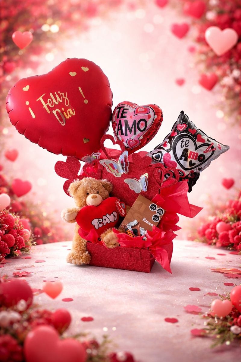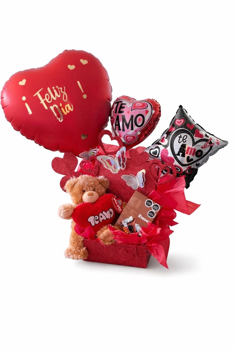 Caja sorpresa con osito peluche, caja de bombones, globo corazón grande, 2 globos pequeños con decoración de papel seda, mariposas decorativas. ( colores de globos, peluche y decoración puede variar según disponibilidad).