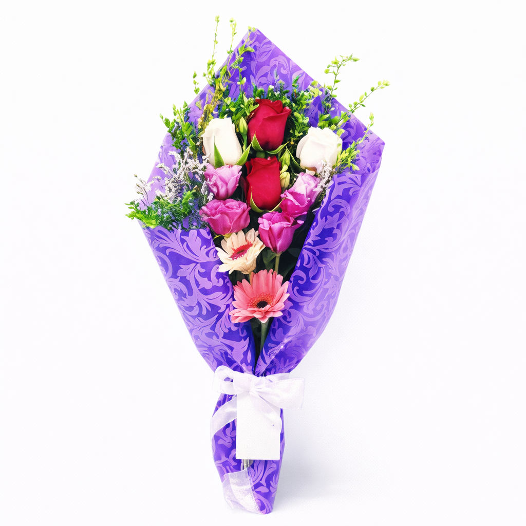 Arreglo compuesto con rosas importadas, con delicados girasoles; acompañado de delicado follaje de estación. disponibilidad de colores de Rosas y decoración puede variar.