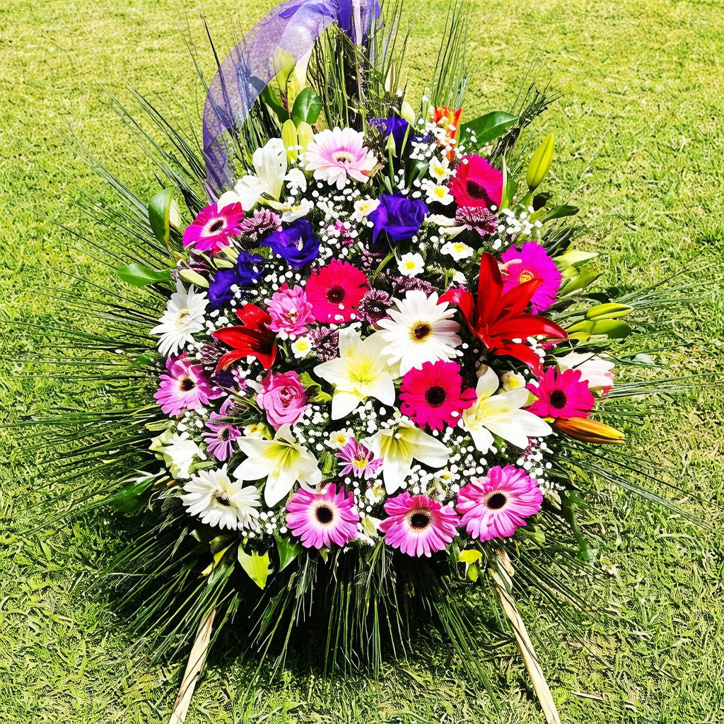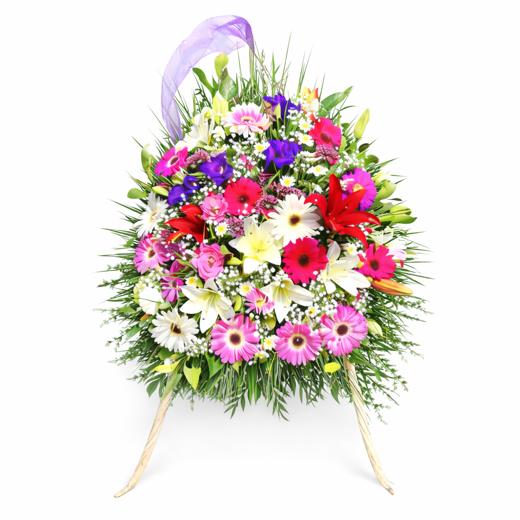 Corona en pedestal, colores y tipo de flores puede variar según stock disponible