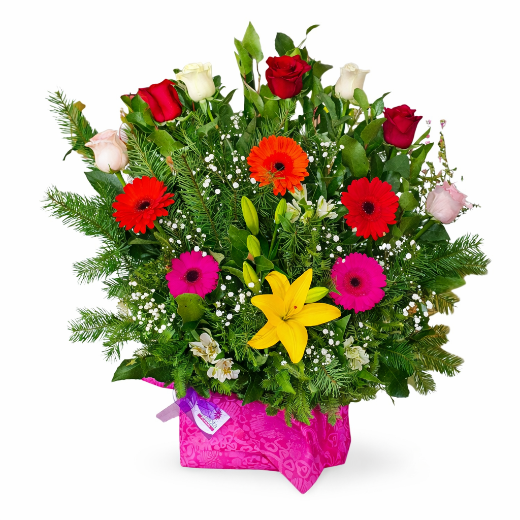 Delicado Arreglo con finas Rosas importadas, delicados Liliums y fino follaje, en base especial metálica, con delicados toques de elegancia.