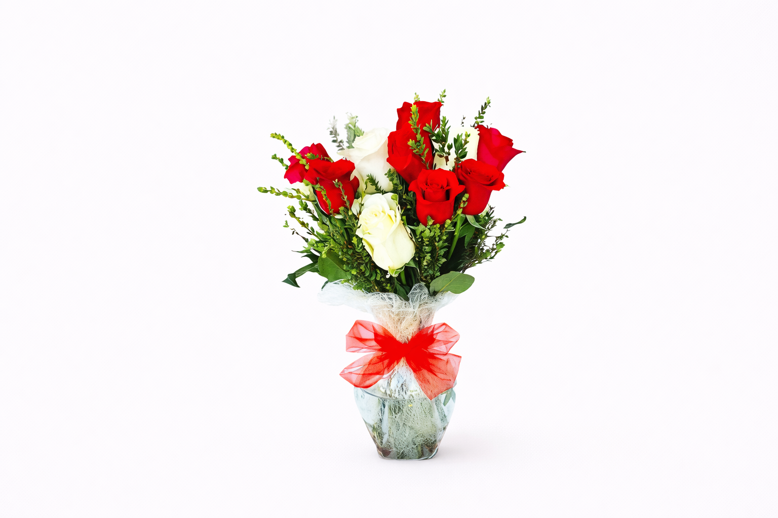 Florero de vidrio con 18 rosas importadas, con follaje de estación, decorado con malla decorativa especial, moño en cinta de organza, colores y decoración sujeto a stock disponible.